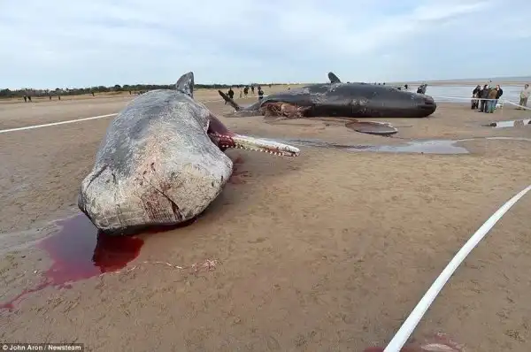 Кашалот бился о камни на мелководье в Ханстантоне до тех пор, пока не умер. Об этом свидетельствуют многочисленные глубокие раны на его теле.