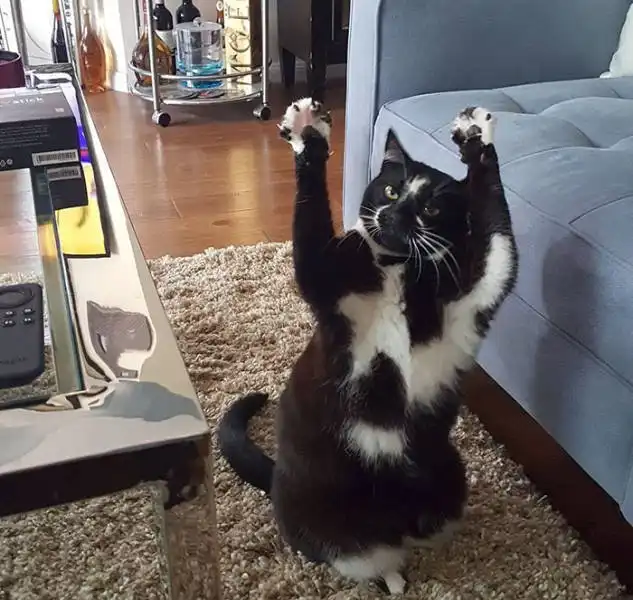 Владелец этой кошки по кличке Кейс говорит, что его домашний питомец постоянно поднимает лапы вверх, словно хочет сдаться в плен. Все началось с того, что хозяин впервые снял кошку с поднятыми лапами, после чего животное стало поднимать лапы каждый раз, когда его фотографировали.