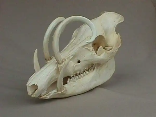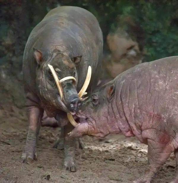 Если быть точнее, то это даже не рога, а такие большие клыки. Причем, чем старше бабирусса, тем длиннее эти клыки. Как можно видеть на фото, они очень сильно изгибаются, почти на 180 градусов. У старых свино-оленей они даже врастают в кожу головы.