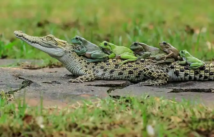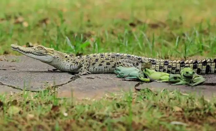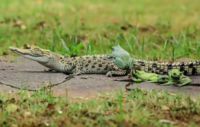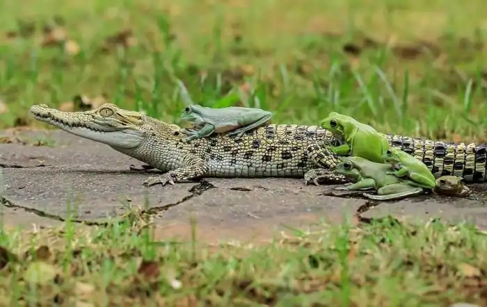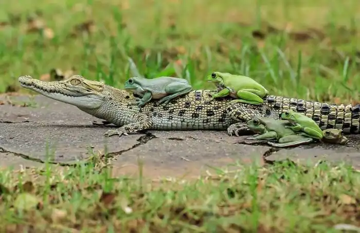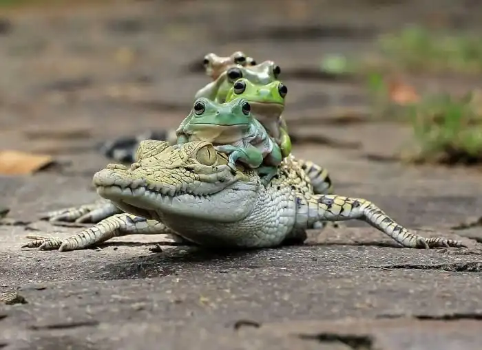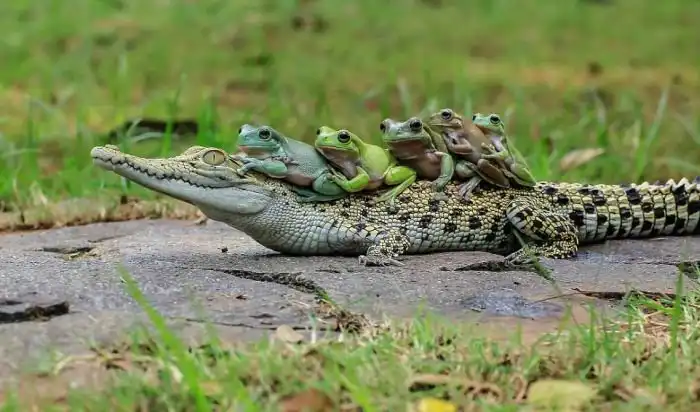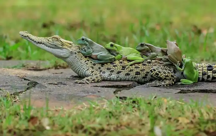 Фотограф Танто Йенсен (Tanto Yensen) близ города Тангеранг в Индонезии стал свидетелем необычного зрелища, когда пять бесстрашных лягушек оседлали каймана. Земноводные взобрались на спину рептилии, которая, судя по всему, решила немного передохнуть. Сам кайман, который питается, в том числе и лягушками, явно не был против подобной компании.