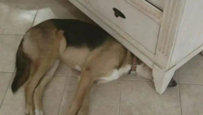 Будучи щенком, эта собака очень любила лежать под тумбой. Несмотря на то, что она выросла, привычка осталась, и теперь ей приходится сталкиваться с кое-какими трудностями.