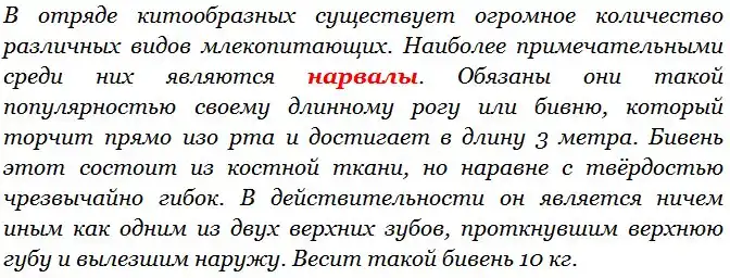 Нарвал – довольно крупное животное. В длину некоторые представители этого вида достигают 5 метров. Обычная же длина колеблется в пределах 4 метров. Вес самца составляет полторы тонны. Самки весят от 900 кг до тонны. У этого млекопитающего почему-то нет спинного плавника. В наличии имеются только боковые плавники и мощный хвост. Голова у нарвала круглая, на ней рельефно выделяется лобный бугор. Рот расположен низко и очень маленький. Брюхо млекопитающего светлого цвета. Спина и голова значительно темнее. Вся верхняя часть тела покрыта серовато-бурыми пятнами разного размера, делающими спину и голову ещё более тёмными. Глаза небольшие, глубоко утопленные, с активно циркулирующей внутриглазной жидкостью. То есть они полностью приспособлены к суровым арктическим условиям, да к тому же ещё и наделены острым зрением.
