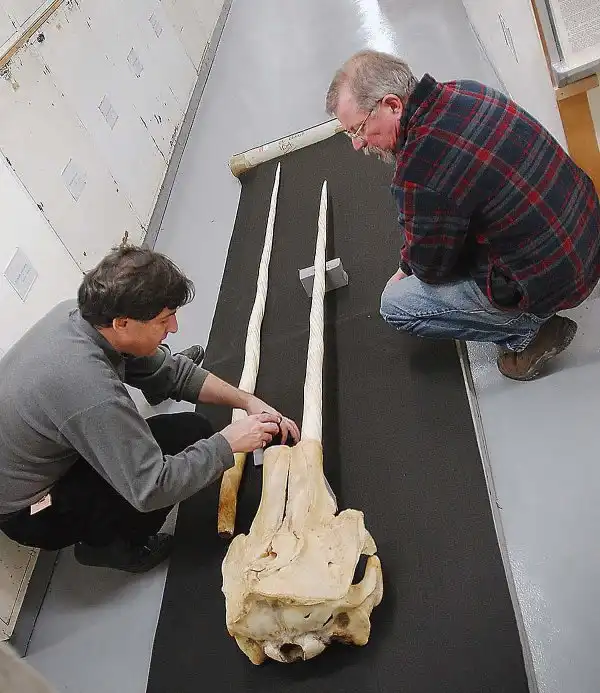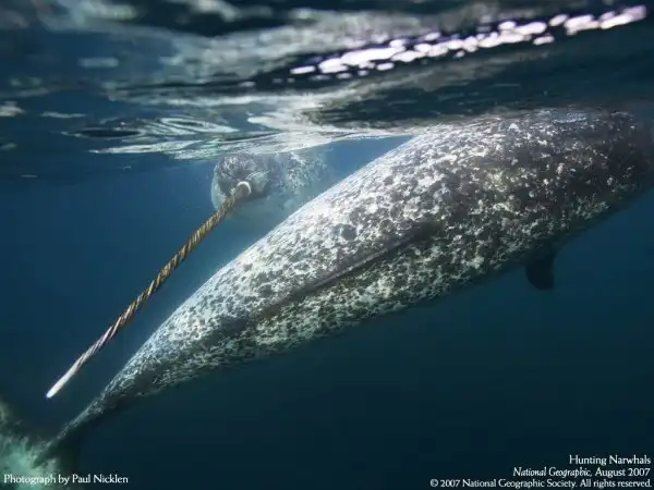 Для большей упругости и надёжности бивень закручен по часовой стрелки и имеет спиралевидную форму. В нём находится огромное количество микроскопических полостей. Заполнены они очень чувствительными нервными окончаниями. Для чего нужен такой сложный и, на первый взгляд, абсолютно бесполезный аппарат животному – на этот вопрос ответа нет. Скорее всего бивень выполняет функции какого-то локатора или приёмо-передающей антенны. Он отслеживает перепады температур, давления в окружающей среде, посредством его нарвал может сообщать своим сородичам об опасности. Всё это догадки и предположения. Смущает также то, что у самок подобных образований нет. Они являются прерогативой особей мужского пола. Самцы часто трутся рогами, таким образом очищая их от минеральных отложений и наростов.