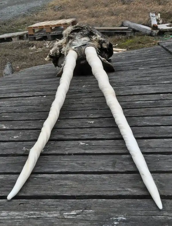 Больше зубов у нарвала нет. У самок и у самцов их всего два. В бивень вырастает левый зуб и только у самцов. Правый зуб скрыт в верхней десне и на протяжении всей жизни никак себя не проявляет. Очень редко у отдельных особей он также начинает стремительно расти и превращается во второй бивень. С чем это связано – неизвестно. Зато ни для кого не секрет, что если нарвал сломает свой бивень или рог, то он уже никогда не вырастает, а рана стремительно затягивается костной тканью, и млекопитающее продолжает жить уже с обломком, не испытывая при этом никакого дискомфорта.