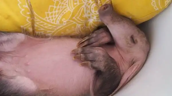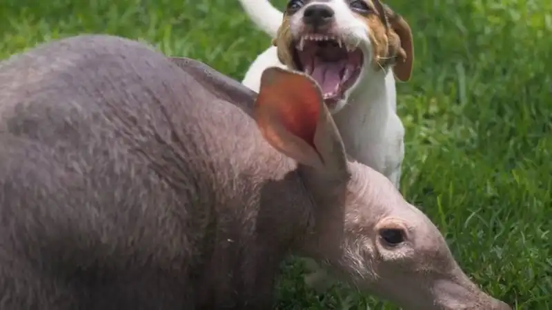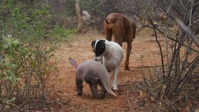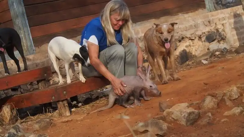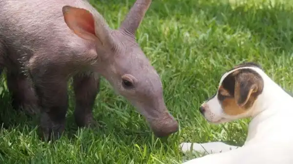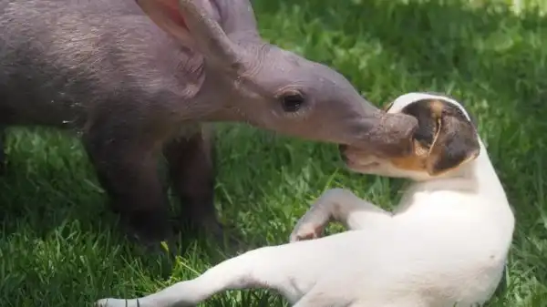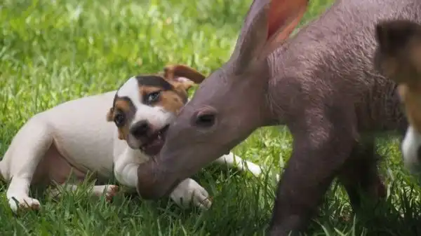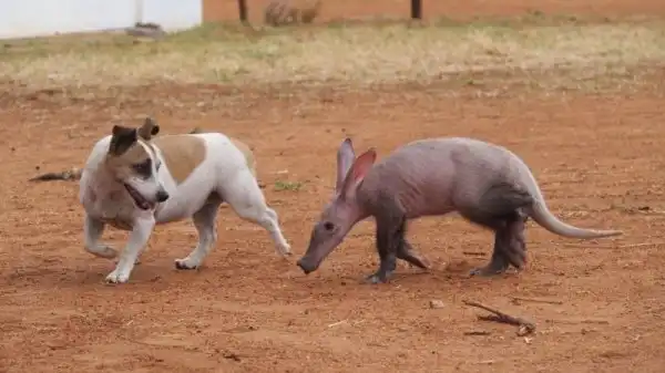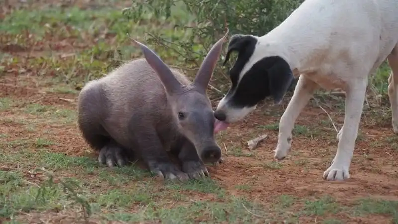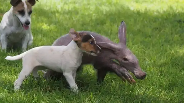 Когда маленькая самка трубкозуба по кличке Джерти попала в приют для животных в Намибии, она была не только ослаблена физически, но и подавлена морально потерей матери. К себе на воспитание ее приняла семья джек-рассел-терьеров, и теперь Джерти тоже считает себя собакой.