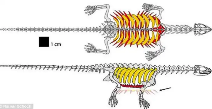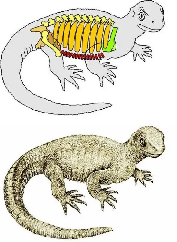 Вернемся еще на 20 миллионов лет назад в пермский период. Тогда жила удивительная рептилия — эунотозавр, которая, к слову, тоже обладала диапсидным черепом. Эунотозавра считают предком всех черепах. Внешне он напоминал ящерицу, проглотившую тарелку, и жил вблизи водоемов, но на суше.