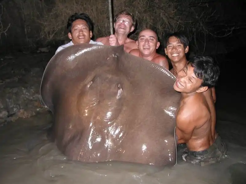 В Таиланде поймали самку ската небывалых размеров. Для того чтобы затащить морскую жительницу в лодку, потребовались усилия 13 взрослых мужчин.