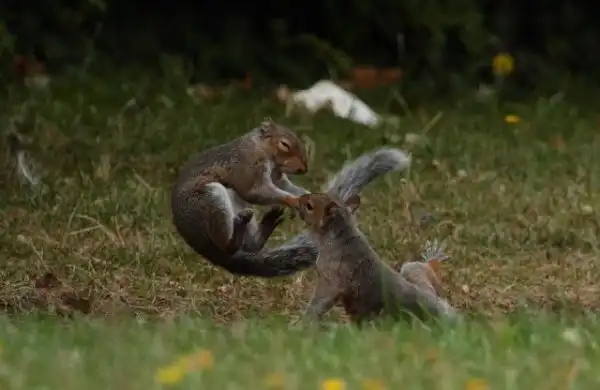 47-летний фотограф-любитель Мартин Докер (Martin Docker) сделал эти удивительные кадры в саду Собачьего острова Лондона. Фотограф говорит: "У меня много снимков птиц, лис и других животных, которые бегали в саду, но на этот раз природа удивила". Две белки, словно в сцене из фильма о боевых искусствах, подпрыгивали и наносили удары друг другу. Неизвестна причина драки и сколько бы продолжался этот бой, но один из зверьков применил грязный прием — он укусил соперника. Тот взвизгнул и убежал.