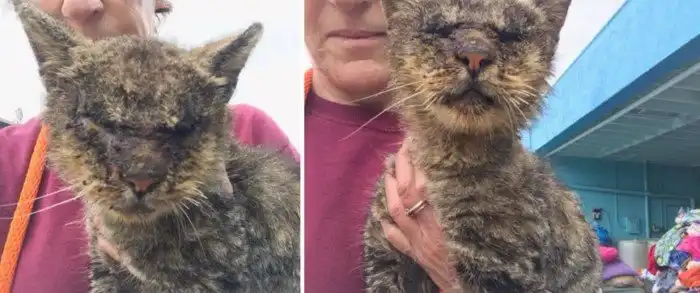 Кот по кличке Валентино попал в приют в Лос-Анджелесе с многочисленными язвами на коже, из-за сгустков крови на морде он практически ничего не видел. Сотрудники приюта боялись к нему подходить и прикасаться без осмотра врача, подозревая, что у него заразные клещи. Но были выходные и ветеринар мог осмотреть его только на следующий день.