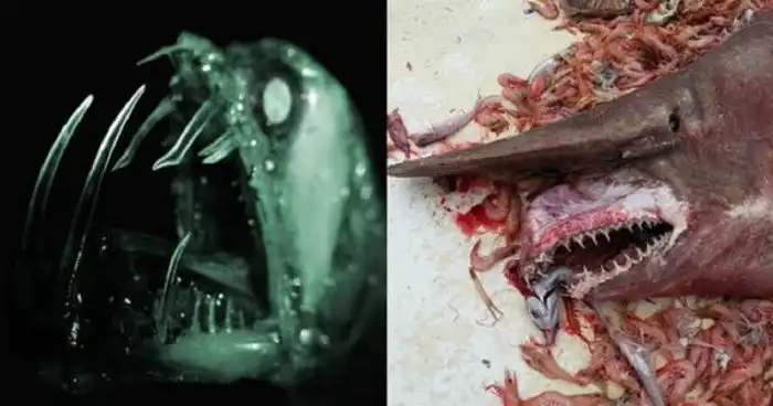 Второе название этого морского страшилища - удильщик. Оно живет на глубине от 1,5 километров и использует для охоты на рыб фонарик, горящий на конце длинного выроста в носовой части. Плывущие на свет рыбки попадают прямо в огромную пасть чудовища, утыканную длинными острыми зубами. Но еще поразительнее семейная жизнь удильщиков. Самки этого вида вырастают до метра - в несколько раз больше самцов. самец, подплывая к даме сердца, вцепляется в нее зубами и уже не отпускает. Постепенно он буквально врастает в нее, объединяя с ней кровеносную и пищеварительную системы. Ученым попадались экземпляры самок удильщика, прирастивших к себе до шести самцов!