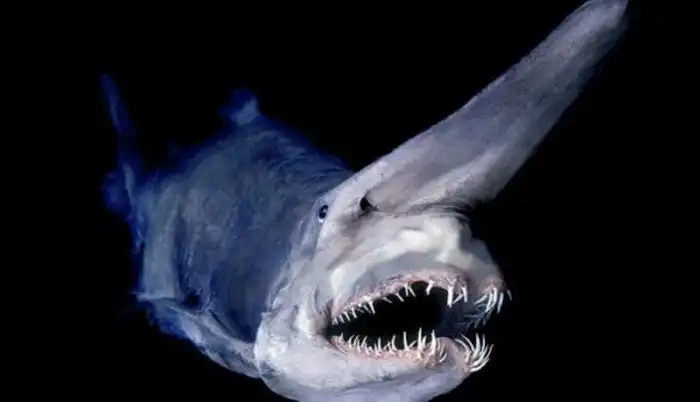 Акула-гоблин - современник динозавров, древнейший представитель семейства акул. Ее возраст насчитывает 125 миллионов лет! В отличие от большинства современных акул, зубы у нее очень мелкие - однако в огромных челюстях акулы-гоблина тонкие зубы-иглы растут в несколько рядов, а сами челюсти устроены так, что могут далеко выдвигаться вперед. Огромный клювообразный вырост - это нос, который помогает ей учуять добычу. Акула-гоблин водится в морях у берегов Японии, живет на больших глубинах и редко показывается людям.