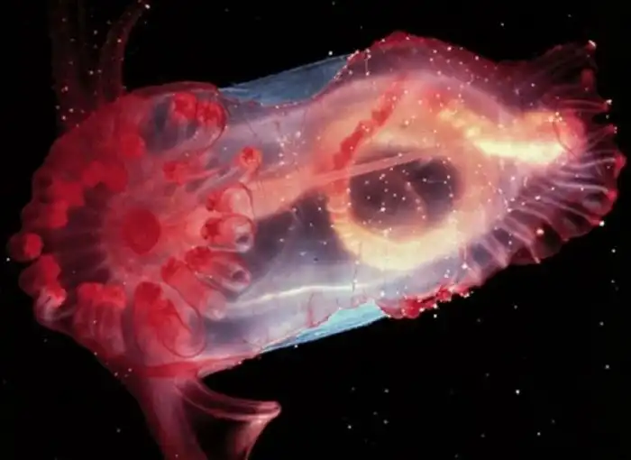 Это полупрозрачное существо, похожее на миниатюрную галактику, по-английски называется куда романтичнее - "розовая морская фантазия". Действительно, выглядит она просто фантастически! Небольшое сказочное существо принадлежит к роду морских огурцов и живет на больших глубинах, почти в 9 километрах под поверхностью моря. Больше ученые о нем пока ничего не знают - само его существование было обнаружено лишь несколько лет назад.