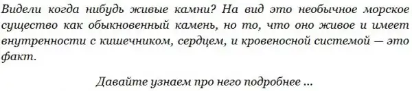 Кроме того, что это необычное морское животное, размером 15-18 см сильно смахивает на отколовшийся участок скалы, к которому было прикреплено, не самая странная вещь, а странно, даже необычно, что оно абсолютно неподвижно, сидит на месте. Мы уже как-то рассматривали разнообразные системы моллюсков, которые тоже довольно оригинальны. Тем не менее, это животное питается, всасывает и пропускает воду через себя, в результате чего отфильтровываются микроорганизмы, планктон, органические остатки, находящиеся во взвешенном состоянии в воде.