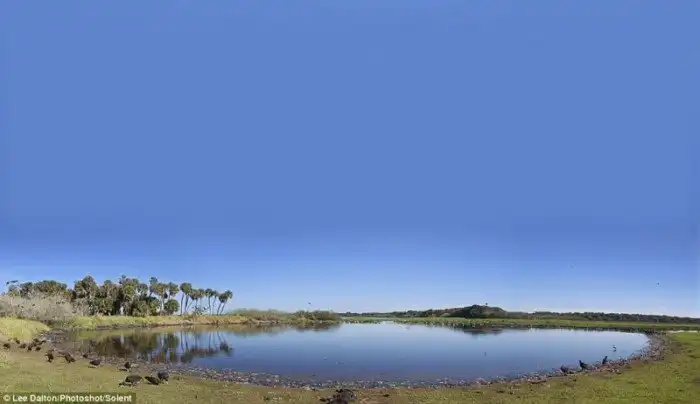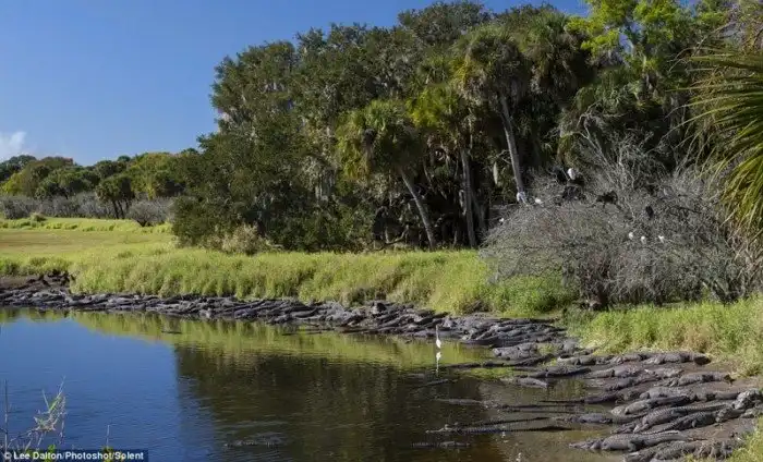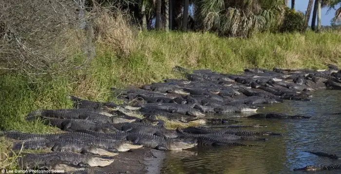 Сотни аллигаторов собрались на берегу одного из глубоких речных омутов в Национальном речном парке Миякки во Флориде. Британский фотограф Ли Далтон, специализирующийся на съемках дикой природы, сумел подобраться к ним достаточно близко, чтобы сделать крупные снимки весенних солнечных ванн аллигаторов. Хотя, по утверждению Далтона, такие сборища страшных рептилий можно заметить издалека, и даже более того: скопление аллигаторов на весеннем пляже можно увидеть на спутниковых снимках Google!