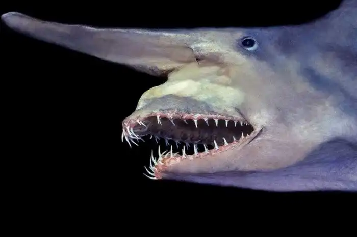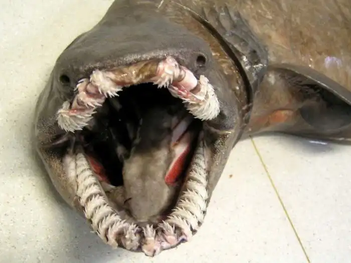 Все глубоководные рыбы имеют нечто жуткое в своей внешности. У двухметровой плащеносной акулы это прежде всего зубы, растущие в разные стороны и представляющие собой целый лес острейших костяных игл. Впрочем, человеку бояться их не стоит: плащеносная аула живет у самого океанского дна на глубине около 2 километров, так что случайная встреча исключена.