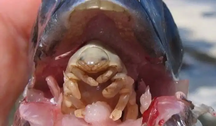Это мелкое ракообразное - единственный известный науки организм-паразит, заменяющий собой целый орган животного, на котором паразитирует. Мокрица проникает в рот рыбы - пятнистого розового люциана - и, присосавшись к основанию его языка, добивается того, что настоящий язык отмирает. Однако рыба этого не замечает, используя в качестве языка присосавшегося паразита. А сам паразит прекрасно себя чувствует, питаясь слизью, выделяемой рыбой. Такое бывает только в глубинах океана!