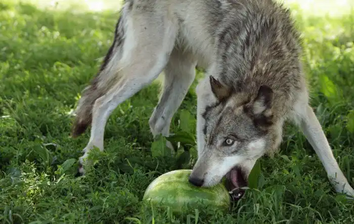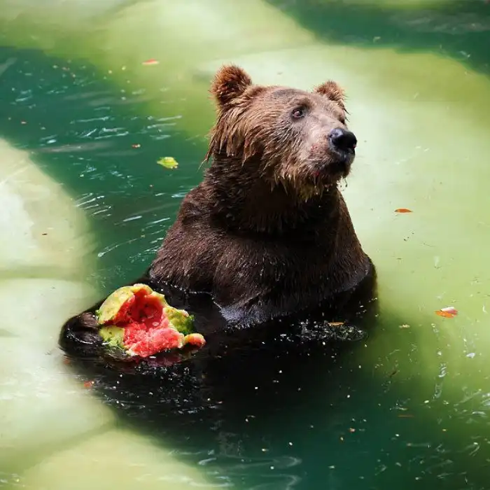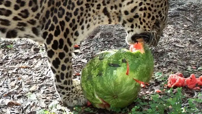 А вот не менее грозный хищник тоже лакомится подаренным ему сочным арбузом