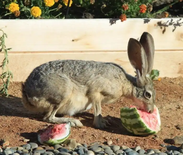 А вот заяц. Он, хоть и является травоядным, но видеть его поедающим арбуз, очень непривычно