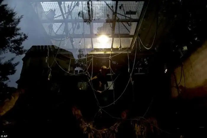 Шимпанзе по-прежнему продолжают жить в своем старом вольере и лазать по веревочным сеткам.
