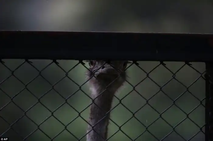 Страус из-за железной сетки следит за происходящими в парке переменами.