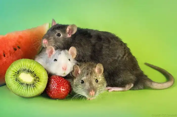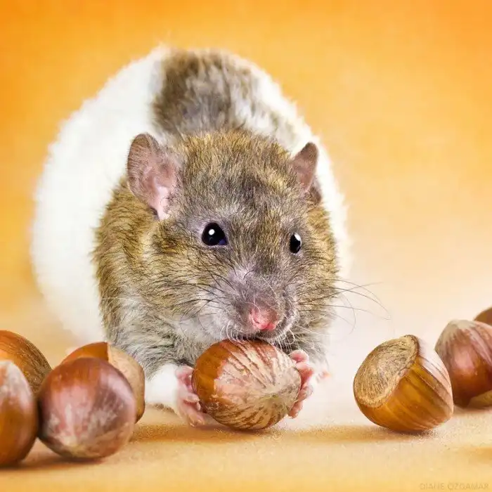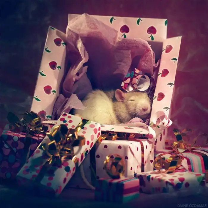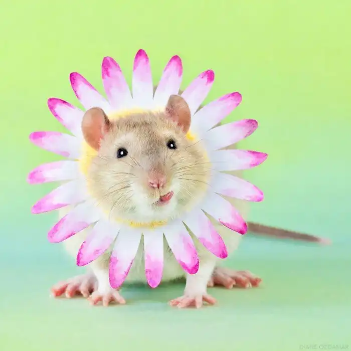 Все аксессуары девушка изготавливала своими руками (за исключением этой шляпки). Во время фотосессий животные чувствовали себя расслабленно, Диана не принуждала их позировать. Ни одна крыска не пострадала, и даже божья коровка улетела вскоре после съемки.