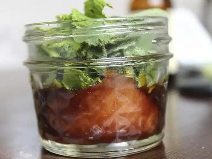 Поместите два ватных шарика в банку и добавьте 4 столовые ложки ванильного экстракта. Затем добавьте туда свежей мяты - так, чтобы заполнила весь оставшийся объем - и накройте банку сверху куском марли.