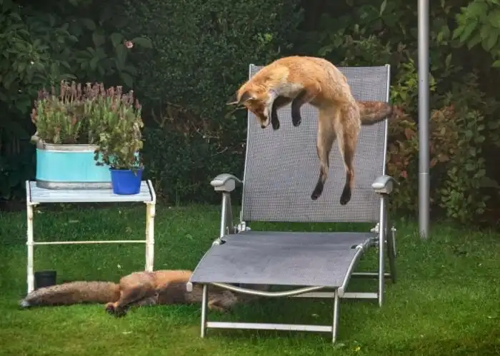 Заметив на своем заднем дворе двух лисиц, играющих у лежака, хозяин дома поспешил сделать несколько снимков, и вот что из этого получилось.