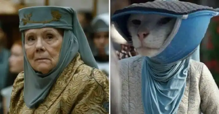 Хозяева котов так старались добиться сходства своих питомцев с Оленной Тирелл, что использовали все, что нашли у себя дома - от пластиковых ведер до занавесок, кепок и даже ломтей хлеба.