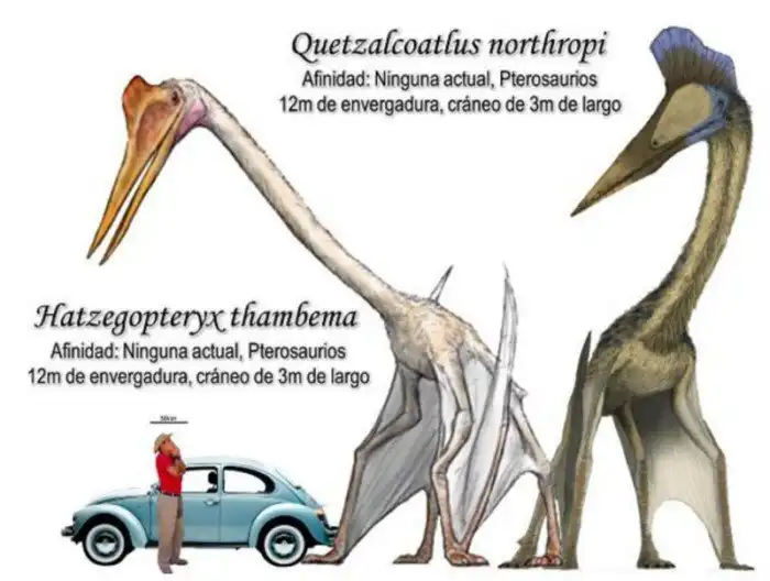 Кетцалькоатль (Quetzalcoatlus northropi) — крупнейшие птерозавры. Масса: 200 – 250 кг. Длина: 10 – 11 м Обитали вдали от моря, где охотились на мелких позвоночных или собирали падаль.