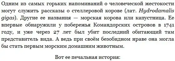 Несчастья морской коровы начались с 1741 года, когда судно «Святой Петр» потерпело крушение около одного из небольших островов, названного впоследствии именем капитана корабля Витуса Беринга. На этом Богом забытом острове команда была вынуждена остаться на зимовку. К сожалению, пережили ее не все, в числе погибших был и капитан. Чтобы выжить, моряки были вынуждены изловить одно из странных морских животных, поедающих водоросли у самого берега.