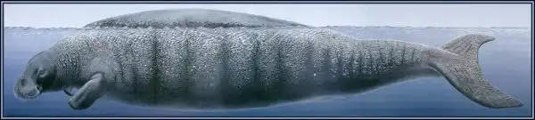 Как же выглядело это животное? По словам Стеллера, это было огромное и очень неповоротливое существо, длина тела которого достигала 7,5-10 метров, а вес — 3,5-11 тонн. Его туловище было очень толстым, а голова на его фоне казалась совсем маленькой. В качестве передних конечностей служили закругленные ласты с одним суставом в центре. Оканчивались они небольшим роговым наростом, похожим на копыто лошади. Вместо задних конечностей у капустницы был мощный раздвоенный хвост.
