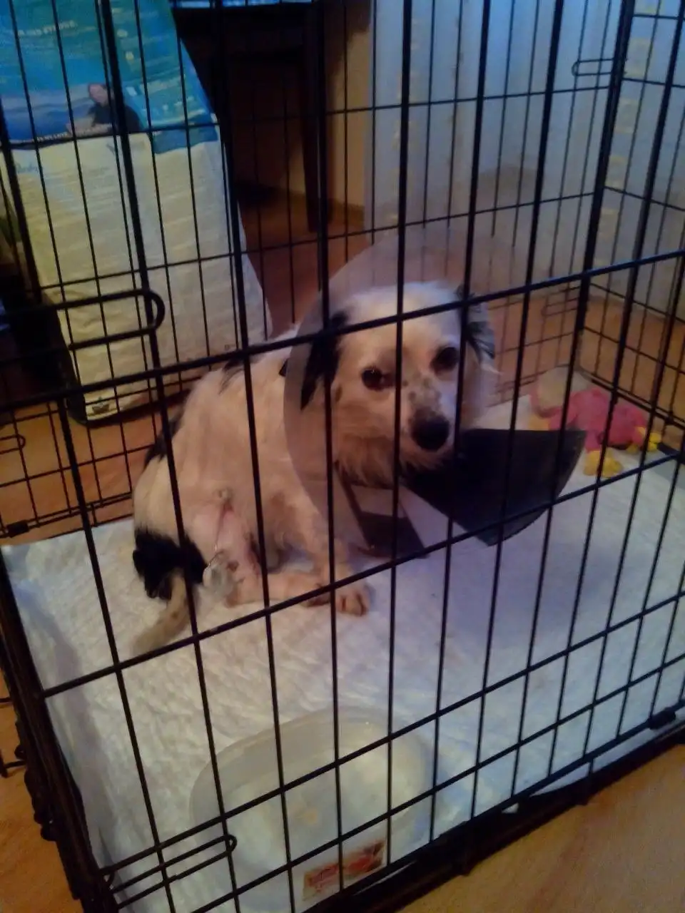 Песика нашли вмерзшего в лед на обочине трассы с двумя переломами. Ему сделали операции и сейчас он находится на реабилитации. Ему нельзя много двигаться. Содержание в клетке и непродолжительный выгул.