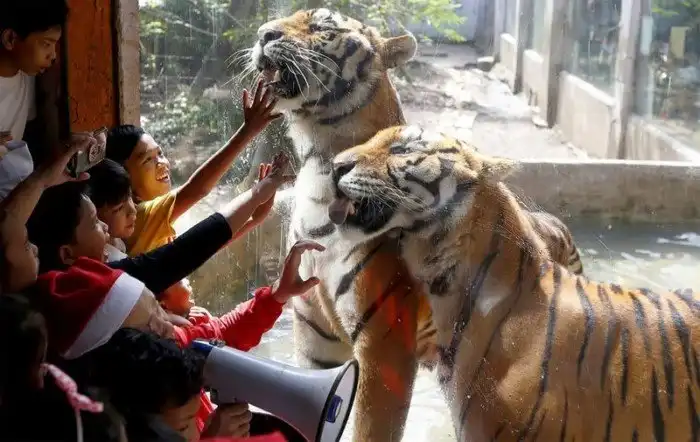 19. Лорд-барьер Барбари, стоит рядом со своим отцом «Шредером» в зоопарке в Нойвиде, Германия, 26 июня 2017 года