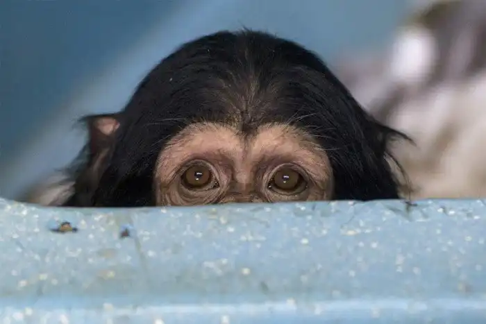11. Один из двух детей-шимпанзе, изъятых у контрабандиста, смотрит, как решается их судьба – детенышей передают в Новосибирский зоопарк 2 февраля 2017 года