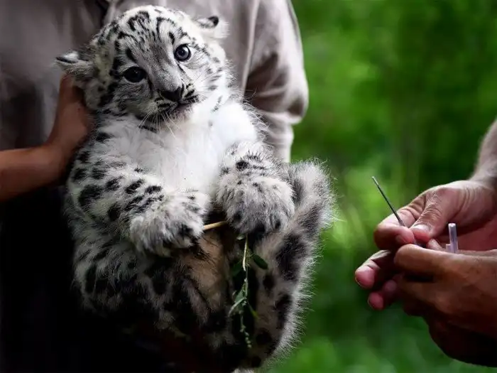 14. Детёныш снежного барса готов получить свою первую вакцинацию 10 августа 2017 года в зоопарке Тирпарк в Берлине