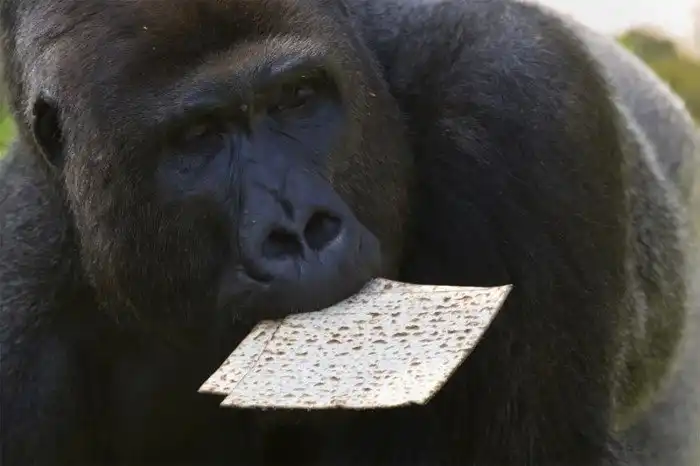 16. Горилла ест мацу недалеко от Тель-Авива, Израиль, 6 апреля 2017 года. Горилл и других животных обычно кормят хлебом, но во время недельного праздника Пасхи им дается маца