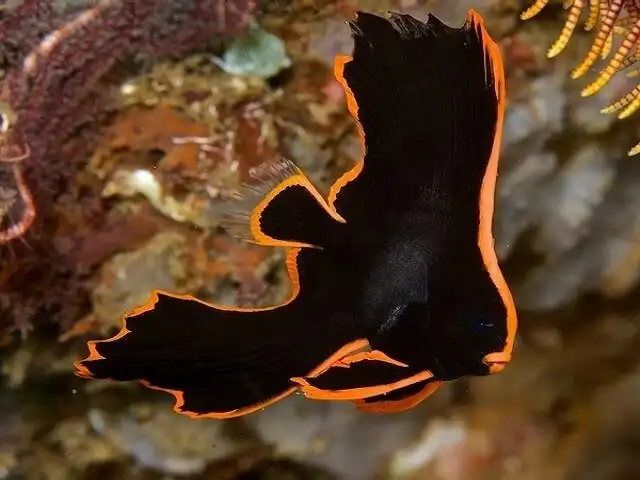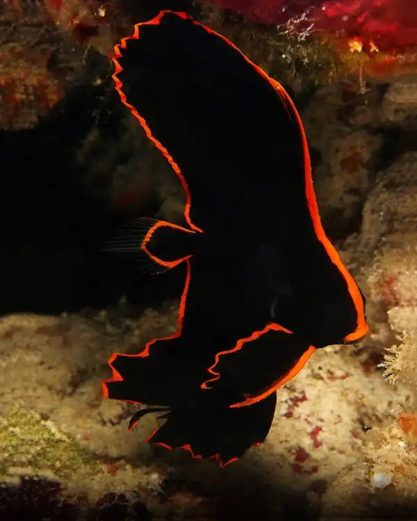 Platax pinnatus рыба большая. В аквариумных условиях ее размер может достигать 45 см, а в природе доходит до 70 см. По-большому счету платакс нетопырь является одной из самых красивых и грациозных рыб, за красотой которых можно наблюдать часами. Анальное и спинное оперение платаксов высокое и широкое и когда смотришь на рыбу кажется, что этих плавников и нет вовсе, а это все такое гибкое тело, но на самом деле это не так. За счет своего оперения тело рыбы имеет треугольную форму. Весь периметр тела и плавников имеет яркую окантовку оранжевого цвета, причет у молоди эта окантовка более широкая и яркая. Грудные плавники бесцветные. Все тело окрашено матовый черный цвет.