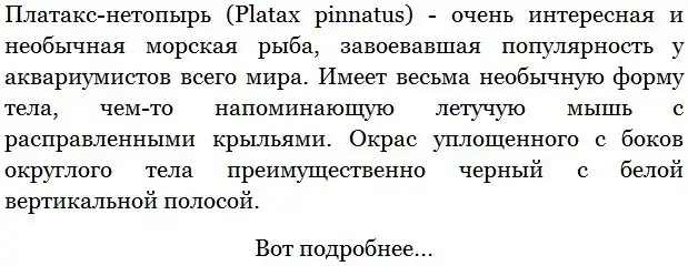 Платакс нетопырь (Red-fin bat, Red-rimmed bat, Red-Pinnatus bat) – удивительная по красоте морская рыба, обитающая в западной части Тихого океана. Сразу нужно сказать, что увидеть этих рыб в аквариуме можно очень редко и связано это прежде всего с чрезвычайной трудностью содержания их в неволе. Большинство пойманных рыб и помещенных в аквариум умирает от голода, несмотря на обилие пищи в нем. Кроме того, если вопрос с едой будет решен, тем не менее, чтобы рыбы не погибли, требуется поддержание идеальных параметров воды. Учитывая все вышесказанное содержать данных рыб под силу лишь профессиональным аквариумистам.