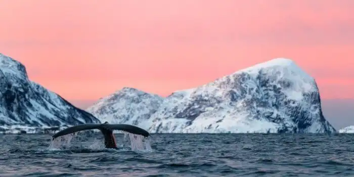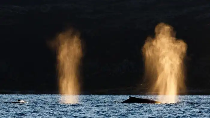Бергерсен говорит, что закат - идеальное время для фотографирования китов, поскольку на золотистом свету можно увидеть фонтаны из мельчайших водяных брызг, и их очертания могут быть совершенно удивительными.