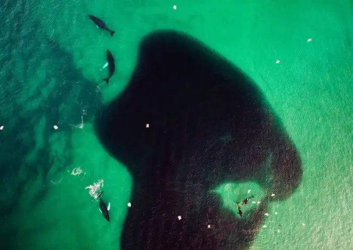 Эта изумительная фотография сделана с помощью дрона. Киты - вторые по величине млекопитающие на планете, и их численность сильно страдает от коммерческого китобойного промысла.