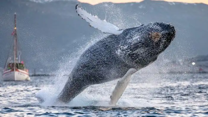 Бергерсен рассказал, что просто щелкал камерой, когда этот горбатый кит внезапно выпрыгнул из воды. Пассажиры лодки (на заднем плане) тоже стали свидетелями завораживающего зрелища.
