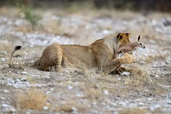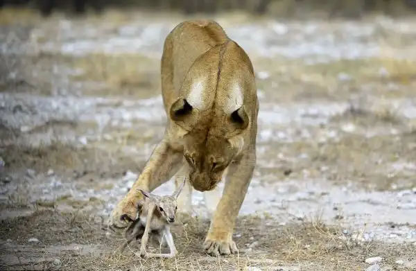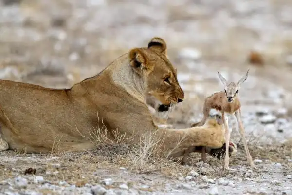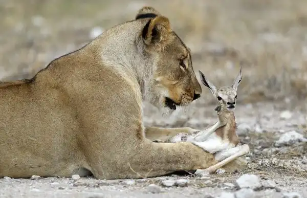 Глядя на эти кадры, можно подумать, что львица играет с едой, но это не так. Большая хищная кошка заботиться о маленькой антилопе спрингбок, как о собственном потомстве. Хоть антилопа и является естественной добычей, эта скорбящая львица приняла теленка после того, как ее собственных детенышей убил лев из конкурирующего прайда. Львица нежно ухаживает за антилопой и оберегает ее от опасностей. Она даже защитила теленка от пары беременных львиц, которые бродили в поисках пищи. Эти умилительные кадры сделал фотограф из Нью-Йорка Гордон Донован (Gordon Donovan) в Национальном парке Этоша в Намибии.