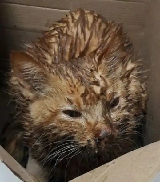 Об истории этого кота узнали еще прошлой зимой. Животного обнаружили под стенами ветеринарной клиники в картонной коробке. Пушистый пребывал в критическом состоянии и даже не мог подняться на лапы. От него разило гнилым запахом, он был полностью испачкан.