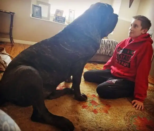 Знакомьтесь, это Евфрат - самый большой в мире щенок, которому всего 9 месяцев от роду. Хозяин собаки, 41-летний Джаред Хоузер, говорит, что его питомец является ближайшим генетическим потомком месопотамского молосса. Евфрат относится к новой породе американский молосс и уже достиг невероятных размеров: его высота - 1,8 метра, а вес - 80 кг. Щенку достаточно всего лишь повилять хвостом, чтобы сбить с ног взрослого человека.