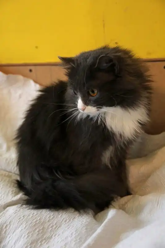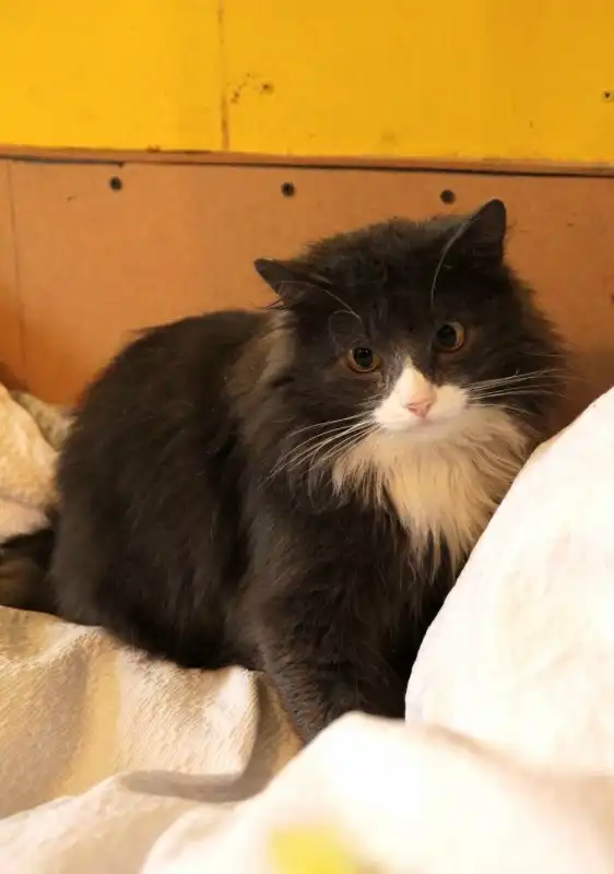 Георгий - крупный пушистый кот голубого окраса с белым носом и в белых тапочках. Найден на улице. Возраст примерно 3 года. Спокойный, рассудительный кот, от внимания к себе не отказывается, может и поиграть, и побегать, но сам инициативы не проявляет. Питается готовыми кормами, пользуется лотком. Кастрирован.