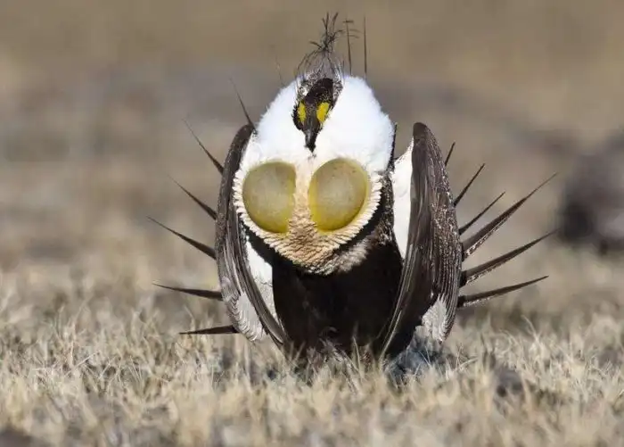 Необычными мешками на груди обладают только самцы шалфейного тетерева. Они служат для извлечения громких звуков в брачный период. Эти птицы семейства фазановых населяют полынные степи на территории Северной Америки.