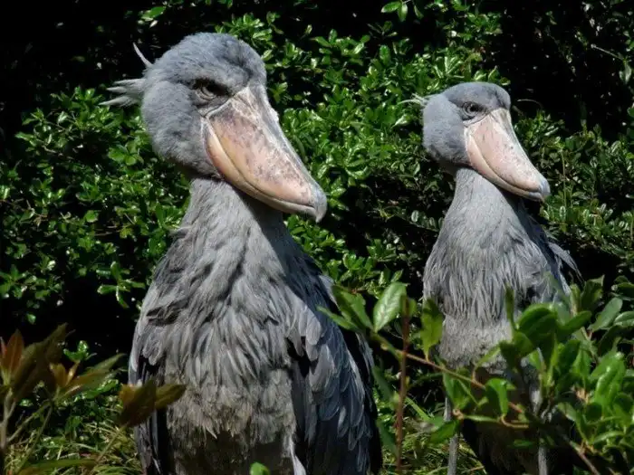 Эта необычная птица семейства аистовых по внешнему виду напоминает скорее существо эпохи динозавров, чем аиста. Встретить такую парочку, как на фото, можно в заболоченных районах Центральной Африки, где они повсеместно являются исчезающим видом. Размах крыльев птички достигает 2-х метров, а рост составляет 1,2 метра. Питаются китоглавы, как и большинство аистовых, мелкими рыбками, лягушками и змеями.