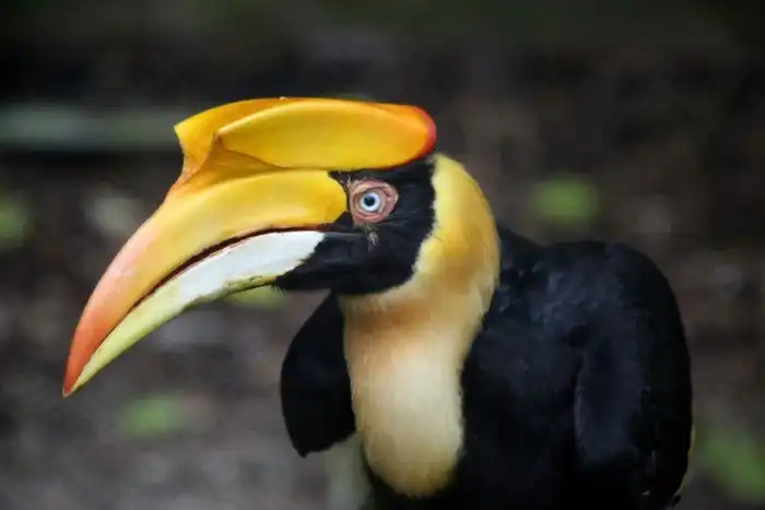 Это крупная птица-носорог, размеры которой достигают 1,5 метров. Большие индийские калао обитают в тропических лесах Юго-Восточной Азии и питаются плодами деревьев, среди которых больше всего ценят плоды фигового дерева.