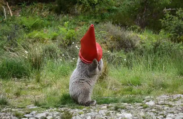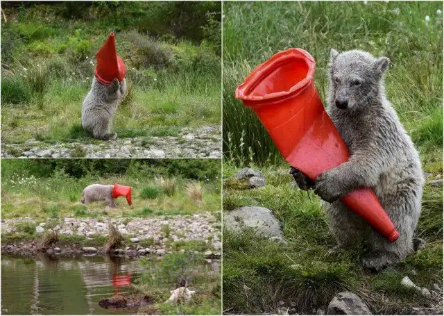 Белый медвежонок по кличке Hamish — первый полярный медведь, рожденный в Великобритании за 25 лет. Он живет в Highland Wildlife Park недалеко от Кингусси в Баденох. Медвежонок родился в декабре прошлого года, а имя ему выбирали 21 000 поклонников парка через онлайн-опрос. Недавно мишка попал в курьезную ситуацию: он играл с дорожным конусом и нечаянно надел его на голову. Конус застрял и медвежонок около часа бегал, пытаясь снять пластмассовую "шляпу". Когда ему это удалось, медвежонок со злобой швырнул конус в води и бросился в объятия мамы.