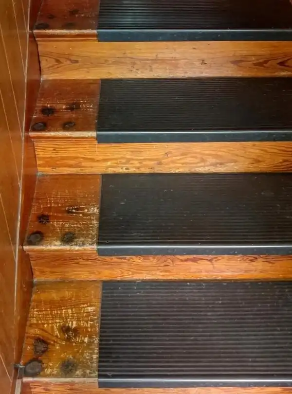 Следы на лестнице, сделанные моей таксой за много лет. Она ходит исключительно по одной траектории